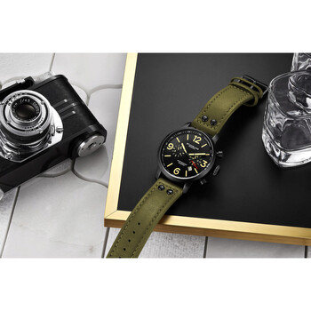 Men's Quartz Black Case, Black Bezel, Black Dial, Black Hands With Off White Luminous Fill, Green Leather Strap Watch Black alloy case with a green leather strap. Fixed tachymeter scale black alloy bezel. Black dial with black hands and Arabic numeral hour markers. Dial Type: Analog. Luminescent hands and markers. Date display between 4 and 5 o'clock position. Quartz movement. Round case shape, case size: 45 mm, case thickness: 10.8 mm. Band width: 22 mm, band length: 9.65 inches. Buckle clasp. Water resistant at 100 meters / 330 feet. Functions: chronograph, date, hour, minute, second. Additional Info: day of month, quick set date, tachymeter. Aviator Series. Sport watch style. Stuhrling Original Aviator Chronograph Quartz Black Dial Men's Watch M17965.