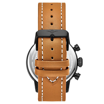 Black alloy case with a tan leather strap. Fixed black alloy bezel. Black dial with luminous black pencil-style hands and index hour markers. Arabic numerals mark the 3, 6, 9 and 12 o'clock positions. Tachymeter markers around the outer rim. Dial Type: Analog. Luminescent hands and markers. Date display between the 4 and 5 o'clock positions. Two sub-dials displaying: 12 hours and 24 hours. Quartz movement. Scratch resistant mineral crystal. Pull / push crown. Solid case back. Round case shape. Case size: 45 mm. Case thickness: 10.8 mm. Band width: 20 mm. Band length: 9.65 inches. Tang clasp. Water resistant at 100 meters / 330 feet. Functions: date, hour, minute, second, tachymeter, 24 hour. Aviator Series. Casual watch style. Stuhrling Original Aviator Quartz Black Dial Men's Watch M13648.