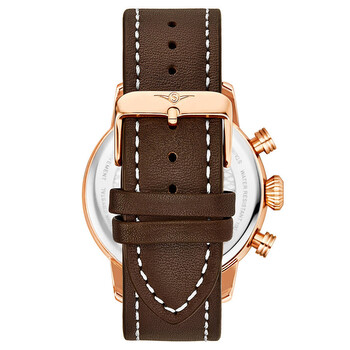 Rose gold-tone alloy case with a brown leather strap. Fixed rose gold-tone alloy bezel. Blue dial with luminous rose gold-tone pencil-style hands and index hour markers. Arabic numerals appear at the 3, 6, 9 and 12 o'clock positions. Tachymeter markers around the outer rim. Dial Type: Analog. Luminescent hands. Date display between the 4 and 5 o'clock positions. Quartz movement. Scratch resistant mineral crystal. Pull / push crown. Solid case back. Round case shape. Case size: 45 mm. Case thickness: 10.8 mm. Band width: 20 mm, band length: 9.65 inches. Tang clasp. Water resistant at 100 meters / 330 feet. Functions: date, hour, minute, second, tachymeter, 24 hour. Aviator Series. Casual watch style. Stuhrling Original Aviator Quartz Blue Dial Men's Watch M13647.