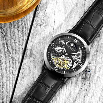 Silver-tone alloy case with a black leather strap. Fixed silver-tone alloy bezel. Black skeleton dial with silver-tone leaf-style hands and index hour markers. Arabic numerals mark the 3, 6, 9 and 12 o'clock positions. Minute markers around the outer rim. Dial Type: Analog. Two sub-dials displaying: am/pm indicator and 12 hour (dual time). Automatic movement. Scratch resistant mineral crystal. Pull / push crown. Transparent case back. Round case shape. Case size: 44 mm. Case thickness: 12.5 mm. Band width: 22 mm. Band length: 8.5 inches. Tang clasp. Water resistant at 50 meters / 165 feet. Functions: hour, minute, am/pm indicator, dual time. Legacy Series. Dress watch style. Stuhrling Original Legacy Automatic Black Dial Men's Watch M13601.