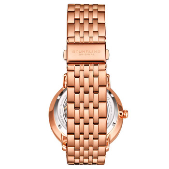 Rose gold-tone alloy case with a rose gold-tone stainless steel bracelet. Fixed rose gold-tone alloy bezel. Black (skeletonized center) dial with rose gold-tone hands and index hour markers. Minute markers around the outer rim. Dial Type: Analog. Automatic movement. Scratch resistant mineral crystal. Pull / push crown. Transparent case back. Round case shape. Case size: 42 mm. Case thickness: 9.75 mm. Band length: 8.8 inches. Deployment clasp with a push button release. Water resistant at 30 meters / 100 feet. Functions: hour, minute, second. Dress watch style. Stuhrling Original Legacy Automatic Black Dial Men's Watch Stuhrling Original Legacy Automatic Black Dial Men's Watch M13614