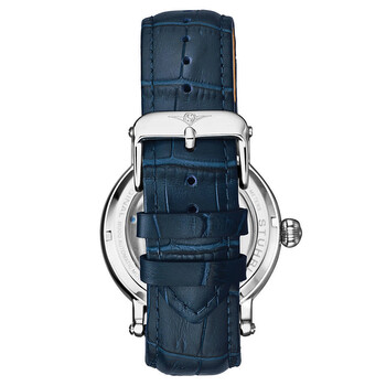Silver-tone alloy case with a blue leather strap. Fixed silver-tone alloy bezel. Blue skeleton dial with gold-tone leaf-style shape hands and index hour markers. Dial Type: Analog. Two sub-dials displaying: am/pm indicator and dual time. Automatic movement. Scratch resistant mineral crystal. Pull / push crown. Semi-transparent case back. Round case shape, case size: 43 mm, case thickness: 12 mm. Band length: 9 inches. Buckle clasp. Water resistant at 30 meters / 100 feet. Functions: hour, minute, am/pm indicator, dual time. Dress watch style. Stuhrling Original Legacy Automatic Blue Dial Men's Watch M13582.