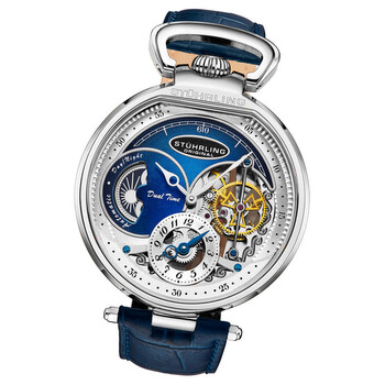 Men's Automatic Dual Time; Alloy Silver Case; Silver And Blue Skeleton Dial; Blue Leather Strap Silver-tone alloy case with a blue leather strap. Fixed silver-tone alloy bezel. Blue dial with silver-tone hands and Arabic numeral hour markers. Dial Type: Analog. Automatic movement. Round case shape, case size: 46 mm. Functions: hour, minute, second. Additional Info: am/pm indicator, dual time, crown guard. Legacy Series. Dress watch style. Stuhrling Original Legacy Automatic Blue Dial Men's Watch M17981.