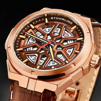 Rose gold-tone alloy case with a brown leather strap. Fixed rose gold-tone alloy bezel. Brown (cut-out) dial with luminous brown dauphine-style hands and index hour markers. Minute markers around the outer rim. Dial Type: Analog. Luminescent hands and markers. Automatic movement. Scratch resistant Krysterna crystal. Pull / push crown. Transparent case back. Round case shape. Case size: 44 mm. Case thickness: 13 mm. Band length: 9 inches. Deployment with push button release clasp. Water resistant at 50 meters / 165 feet. Functions: date, hour, minute, second. Legacy Series. Dress watch style. Watch label: Swiss Made. Stuhrling Original Legacy Automatic Brown Dial Men's Watch M13482.