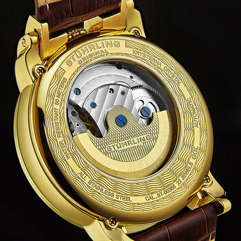Yellow gold-tone stainless steel case with a brown leather strap. Fixed yellow gold-tone bezel. Gold (skeleton center) dial with blue sword-shaped hands and index hour markers. Dial Type: Analog. Two sub-dials displaying: am/pm and 12 hour (dual time). Automatic movement. Scratch resistant mineral crystal. Pull / push crown. Transparent case back. Round case shape. Case size: 47 mm. Case thickness: 13 mm. Band length: 8.75 inches. Tang clasp. Water resistant at 50 meters / 165 feet. Functions: hour, minute, am/pm indicator , dual time. Legacy Series. Dress watch style. Stuhrling Original Legacy Automatic Gold Dial Men's Watch M13514.