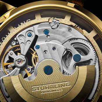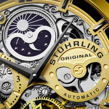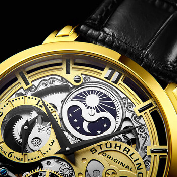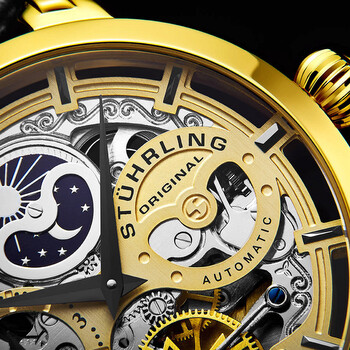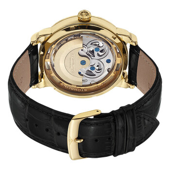 Yellow gold-tone stainless steel case with a black leather strap. Fixed yellow gold-tone bezel. Gold (open heart) dial with black dauphine-style hands and index hour markers. Dial Type: Analog. Two sub-dials displaying: am/pm indicator and 12 hour (dual time). Automatic movement. Scratch resistant mineral crystal. Pull / push crown. Transparent case back. Round case shape. Case size: 47 mm. Case thickness: 15.14 mm. Band length: 9.25 inches. Tang clasp. Water resistant at 50 meters / 165 feet. Functions: hour, minute, am/pm indicator , dual time. Dress watch style. Stuhrling Original Legacy Automatic Gold Dial Men's Watch M13530.