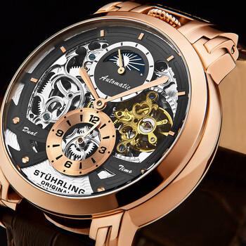 Rose gold-tone stainless steel case with a brown leather strap. Fixed rose gold-tone bezel. Gunmetal (skeleton) dial with rose gold-tone sword-shaped hands and index hour markers. Dial Type: Analog. Two sub-dials displaying: am/pm indicator and 12 hour (dual time). Automatic movement. Scratch resistant mineral crystal. Pull / push crown. Transparent case back. Round case shape. Case size: 47 mm. Case thickness: 13 mm. Band length: 8.75 inches. Tang clasp. Water resistant at 50 meters / 165 feet. Functions: hour, minute, am/pm indicator , dual time. Legacy Series. Dress watch style. Stuhrling Original Legacy Automatic Gunmetal Dial Men's Watch M13510.
