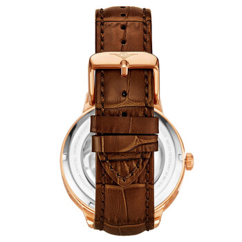Rose gold-tone alloy case with a brown leather strap. Fixed rose gold-tone alloy bezel. Gunmetal (skeleton center) dial with rose gold-tone leaf-style hands and Arabic numeral hour markers. Minute markers around the outer rim. Dial Type: Analog. Two sub-dials displaying: am/pm indicator and dual time. Automatic movement. Scratch resistant mineral crystal. Pull / push crown. Transparent case back. Round case shape. Case size: 40 mm,06 case thickness: 12.5 mm. Band length: 8.25 inches. Tang clasp. Water resistant at 50 meters / 165 feet. Functions: hour, minute, am/pm indicator, dual time. Legacy Series. Dress watch style. Stuhrling Original Legacy Automatic Gunmetal Dial Men's Watch M13593.