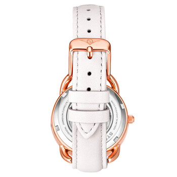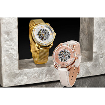 Rose gold-tone alloy case with a white leather strap. Fixed rose gold-tone alloy bezel. Rose gold-tone dial with rose gold-tone hands and Roman numeral & index hour markers. Dial Type: Analog. Automatic movement. Scratch resistant mineral crystal. Pull / push crown. Transparent case back. Round case shape, case size: 36 mm, case thickness: 12 mm. Band width: 16 mm, band length: 8 inches. Buckle clasp. Water resistant at 50 meters / 165 feet. Functions: hour, minute, second. Legacy Series. Dress watch style. Stuhrling Original Legacy Automatic Rose Gold Dial Ladies Watch M16852.