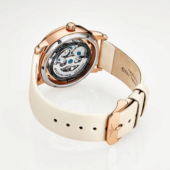 Rose gold-tone alloy case with a white leather strap. Fixed rose gold-tone alloy bezel. Rose gold (skeletonized) dial with black hands and index hour markers. Arabic numerals mark the 3, 6, 9 and 12 o'clock positions. Dial Type: Analog. Automatic movement. Scratch resistant mineral crystal. Pull / push crown. Transparent case back. Round case shape. Case size: 40 mm. Case thickness: 13 mm. Band width: 20 mm. Band length: 8.5 inches. Tang clasp. Water resistant at 50 meters / 165 feet. Functions: hour, minute, second. Legacy Series. Dress watch style. Stuhrling Original Legacy Automatic Silver Dial Ladies Watch M13626.