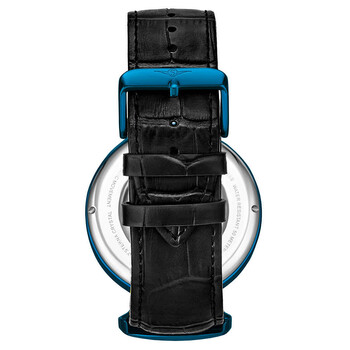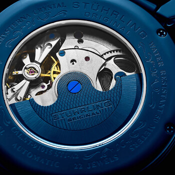 Blue alloy case with a black leather strap. Fixed blue alloy bezel. Silver-tone dial with blue Breguet-style shape hands and index hour markers. Minute markers around the outer rim. Dial Type: Analog. Two - am/pm indicator, dual time subdials. Automatic movement. Scratch resistant mineral crystal. Pull / push crown. Transparent case back. Round case shape, case size: 46 mm, case thickness: 13.25 mm. Band length: 9 inches. Buckle clasp. Water resistant at 50 meters / 165 feet. Functions: hour, minute, am/pm indicator, dual time. Dress watch style. Stuhrling Original Legacy Automatic Silver Dial Men's Watch M13569.