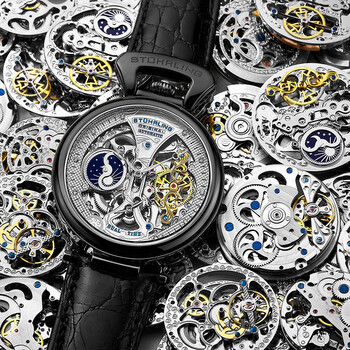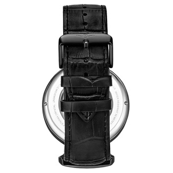 Black alloy case with a black leather strap. Fixed black alloy bezel. Silver-tone dial with silver-tone Breguet-style shape hands and index hour markers. Minute markers around the outer rim. Dial Type: Analog. Two - am/pm indicator, dual time subdials. Automatic movement. Scratch resistant mineral crystal. Pull / push crown. Transparent case back. Round case shape, case size: 46 mm, case thickness: 13.25 mm. Band length: 9 inches. Buckle clasp. Water resistant at 50 meters / 165 feet. Functions: hour, minute, am/pm indicator, dual time. Dress watch style. Stuhrling Original Legacy Automatic Silver Dial Men's Watch M13570.