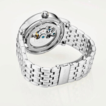 Silver-tone alloy case with a stainless steel bracelet. Fixed silver-tone alloy bezel. Silver skeleton dial with luminous black dauphine-style hands and Roman numeral hour markers. Dial Type: Analog. Luminescent hands. Two displays showing: am/pm indicator and dual time. Automatic movement. Scratch resistant mineral crystal. Pull / push crown. Transparent case back. Round case shape. Case size: 48.2 mm. Case thickness: 12.75 mm. Band width: 22 mm. Band length: 8.25 inches. Deployment clasp with a push button release. Water resistant at 50 meters / 165 feet. Functions: hour, minute, am/pm indicator, dual time. Dress watch style. Stuhrling Original Legacy Automatic Silver Dial Men's Watch M13573.