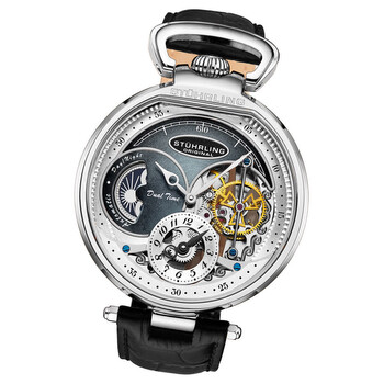 Men's Automatic Dual Time; Alloy Silver Case; Silver And Black Skeleton Dial; Silver Hands; Black Alligator Embossed Leather Strap Watch Silver-tone alloy case with a black leather strap. Fixed silver-tone alloy bezel. Silver-tone dial with silver-tone hands and Arabic numeral hour markers. Dial Type: Analog. Automatic movement. Round case shape, case size: 46 mm. Functions: hour, minute, second. Additional Info: am/pm indicator, dual time, crown guard. Legacy Series. Dress watch style. Stuhrling Original Legacy Automatic Silver Dial Men's Watch M17980.