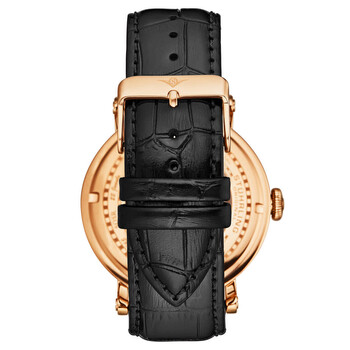Rose Gold Case - Silver Dial- Blue Hands - Rose Gold Crown - Black Strap Rose gold-tone stainless steel case with a black leather strap. Fixed rose gold-tone stainless steel bezel. Silver-tone dial with blue hands and Arabic numeral hour markers. Minute markers around the outer rim. Dial Type: Analog. Luminescent hands. Automatic movement. Round case shape, case size: 47 mm. Tang clasp. Water resistant at 50 meters / 165 feet. Functions: chronograph, hour, minute, second. Legacy Series. Dress watch style. Stuhrling Original Legacy Chronograph Automatic Silver Dial Men's Watch M18231.