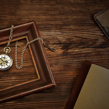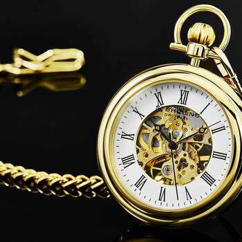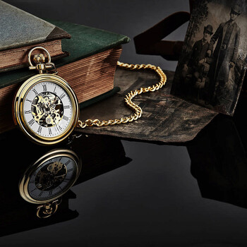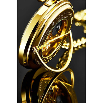 Yellow gold-tone stainless steel case with a yellow gold-tone stainless steel chain. Fixed yellow gold-tone bezel. White (skeleton center) dial with black hands and Roman numeral hour markers. Minute markers around the outer rim. Dial Type: Analog. Hand wind movement. Scratch resistant mineral crystal. Pull / push crown. Transparent case back. Round case shape. Case size: 47 mm. Case thickness: 13.49 mm. Band length: 12 inches. Water resistant at 30 meters / 100 feet. Functions: hour, minute, second. Legacy Series. Dress watch style. Stuhrling Original Legacy Hand Wind White Dial Men's Pocket Watch M13644.