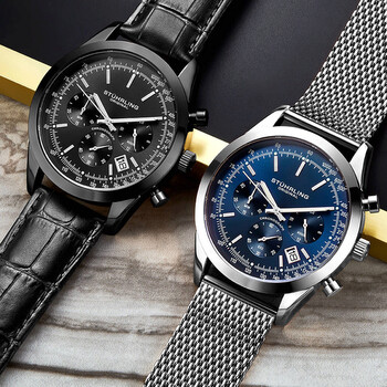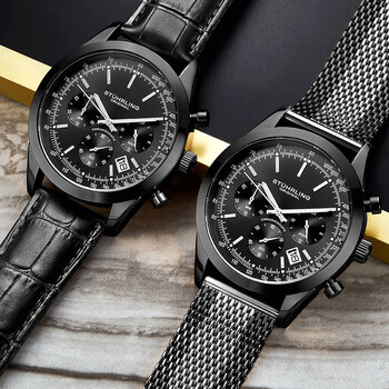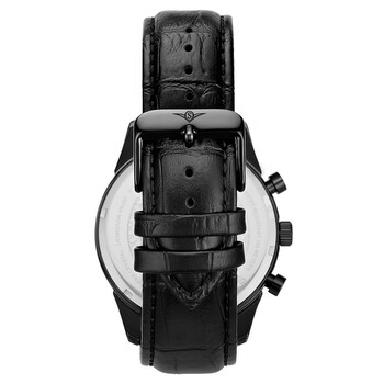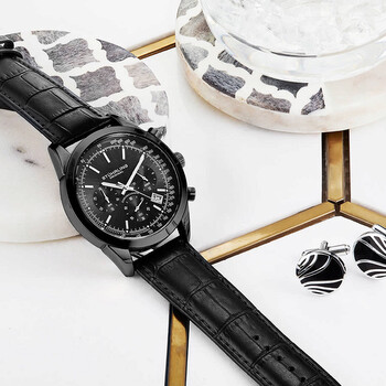 Black alloy case with a black leather strap. Fixed black alloy bezel. Black dial with silver-tone stick-shaped hands and index hour markers. Minute markers. Tachymeter markers around the outer rim. Dial Type: Analog. Luminescent hands and markers. Date display between the 4 and 5 o'clock positions. Chronograph - three sub-dials displaying: 60 second, 30 minute and 24 hour. Quartz movement. Scratch resistant mineral crystal. Pull / push crown. Solid case back. Round case shape. Case size: 44 mm. Case thickness: 10.5 mm. Band width: 20 mm. Band length: 8.5 inches. Tang clasp. Water resistant at 100 meters / 330 feet. Functions: date, hour, minute, second, 24 hour, tachymeter. Monaco Series. Sport watch style. Stuhrling Original Monaco Quartz Black Dial Men's Watch M13651.