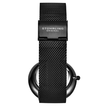 Men's Quartz Multi-Function Black Case, Black Dial, Black Mesh Bracelet Watch Black alloy case with a black stainless steel bracelet. Fixed black alloy bezel. Black dial with yellow gold-tone hands and index hour markers. Dial Type: Analog. Quartz movement. Scratch resistant mineral crystal. Pull / push crown. Solid case back. Round case shape, case size: 39 mm, case thickness: 8.45 mm. Band width: 20 mm, band length: 7.9 inches. Fold over clasp. Water resistant at 30 meters / 100 feet. Functions: date, day, hour, minute, second. Monaco Series. Casual watch style. Stuhrling Original Monaco Quartz Black Dial Men's Watch M16246.