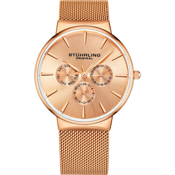 Men's Quartz Multi-Function Rose Case, Rose Dial, Rose Mesh Bracelet Watch Rose gold-tone alloy case with a rose gold-tone stainless steel bracelet. Fixed rose gold-tone alloy bezel. Rose gold-tone dial with rose gold-tone hands and index hour markers. Dial Type: Analog. Quartz movement. Scratch resistant mineral crystal. Pull / push crown. Solid case back. Round case shape, case size: 39 mm, case thickness: 8.45 mm. Band width: 20 mm, band length: 7.9 inches. Fold over clasp. Water resistant at 30 meters / 100 feet. Functions: date, day, hour, minute, second. Monaco Series. Casual watch style. Stuhrling Original Monaco Quartz Rose Gold Dial Men's Watch M16243.