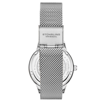 Women's Quartz Crystal Studded Solver Case and Silver Mesh Bracelet, Blue Dial, Silver Hands and Markers Watch Silver-tone alloy case with a silver-tone stainless steel bracelet. Fixed silver-tone alloy bezel. Black dial with silver-tone hands and index hour markers. Minute markers around the outer rim. Dial Type: Analog. Quartz movement. Round case shape, case size: 41 mm. Band width: 16 mm. Fold over clasp with a safety release. Functions: hour, minute, second. Symphony Series. Dress watch style. Stuhrling Original Symphony Quartz Black Dial Ladies Watch M18009.