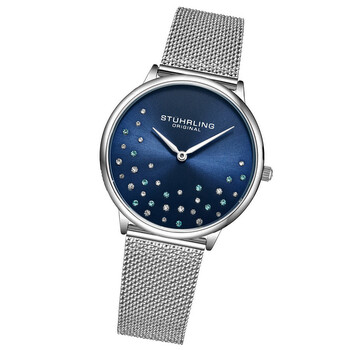 Silver-tone alloy case with a silver-tone stainless steel bracelet. Fixed silver-tone alloy bezel. Blue dial with silver-tone hands. Dial Type: Analog. Quartz movement. Scratch resistant mineral crystal. Pull / push crown. Solid case back. Round case shape, case size: 35 mm, case thickness: 8 mm. Band length: 7.2 inches. Fold over clasp. Functions: hour, minute. Symphony Series. Dress watch style. Stuhrling Original Symphony Quartz Blue Dial Ladies Watch M16778.