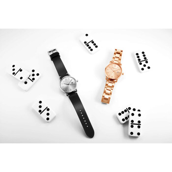 Rose gold-tone alloy case with a rose gold-tone stainless steel bracelet. Fixed rose gold-tone alloy bezel. Rose gold-tone dial with rose gold-tone hands and index hour markers. Minute markers around the outer rim. Dial Type: Analog. Luminescent hands and markers. Date display at the 3 o'clock position. Quartz movement. Scratch resistant mineral crystal. Pull / push crown. Solid case back. Round case shape, case size: 38 mm, case thickness: 10 mm. Band width: 20 mm, band length: 8 inches. Deployment with push button release clasp. Water resistant at 30 meters / 100 feet. Functions: date, hour, minute, second. Symphony Series. Dress watch style. Stuhrling Original Symphony Quartz Rose Gold Dial Men's Watch M16946.