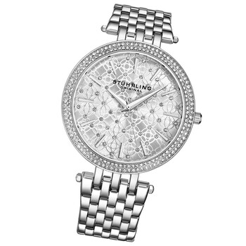 Silver-tone alloy case with a stainless steel bracelet. Fixed silver-tone alloy bezel set with crystals. Silver (crystal-set) dial with silver-tone hands and index hour markers. Dial Type: Analog. Luminescent hands. Quartz movement. Scratch resistant Krysterna crystal. Pull / push crown. Solid case back. Round case shape. Case size: 39 mm. Case thickness: 7.5 mm. Band width: 20 mm. Band length: 8.25 inches. Deployment clasp with a push button release. Water resistant at 50 meters / 165 feet. Functions: hour, minute, second. Symphony Series. Dress watch style. Stuhrling Original Symphony Quartz Silver Dial Ladies Watch M16256.