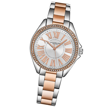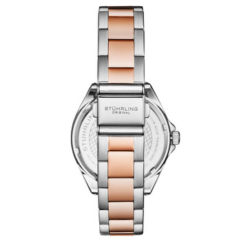 Silver-tone alloy case with a two-tone (silver-tone and rose gold-tone) stainless steel bracelet. Fixed rose gold-tone stainless steel bezel. Silver-tone dial with rose gold-tone hands and Roman numeral hour markers. Minute markers around the outer rim. Dial Type: Analog. Quartz movement. Scratch resistant mineral crystal. Solid case back. Oval case shape, case size: 39 mm. Fold over clasp with a safety release. Functions: hour, minute, second. Symphony Series. Dress watch style. Stuhrling Original Symphony Quartz Silver Dial Ladies Watch M17190.
