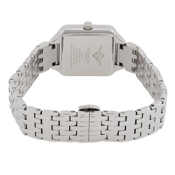 Silver-tone alloy case with a silver-tone stainless steel bracelet. Fixed silver-tone stainless steel bezel. Silver-tone dial with silver-tone hands and Roman numeral & index hour markers. Minute scale around the inner rim. Dial Type: Analog. Quartz movement. Scratch resistant mineral crystal. Pull / push crown. Solid case back. Rectangle case shape, case size: 27 mm. Fold over clasp with a safety release. Functions: hour, minute, second. Symphony Series. Dress watch style. Stuhrling Original Symphony Quartz Silver Dial Ladies Watch M17212.