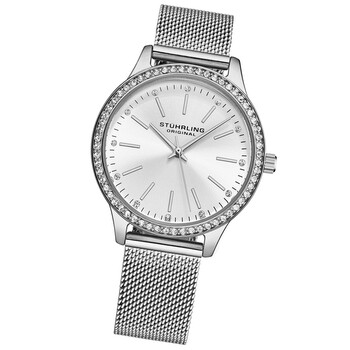 Silver-tone alloy case with a silver-tone stainless steel bracelet. Fixed silver-tone alloy bezel. Silver-tone dial with silver-tone hands and index hour markers. Minute markers around the outer rim. Dial Type: Analog. Quartz movement. Round case shape, case size: 41 mm. Band width: 16 mm. Fold over clasp with a safety release. Functions: hour, minute, second. Symphony Series. Dress watch style. Stuhrling Original Symphony Quartz Silver Dial Ladies Watch M18006.