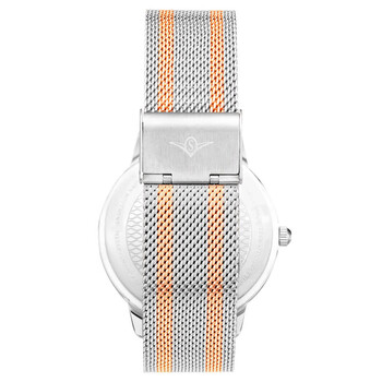 Silver-tone alloy case with a two-tone (silver-tone and rose gold-tone) stainless steel bracelet. Fixed silver-tone alloy bezel. Silver-tone dial with rose gold-tone hands and index hour markers. Dial Type: Analog. Quartz movement. Scratch resistant mineral crystal. Pull / push crown. Solid case back. Round case shape, case size: 42 mm, case thickness: 8 mm. Band width: 20 mm, band length: 9.5 inches. Fold over clasp. Water resistant at 100 meters / 330 feet. Functions: hour, minute. Symphony Series. Dress watch style. Stuhrling Original Symphony Quartz Silver Dial Men's Watch M16804.