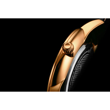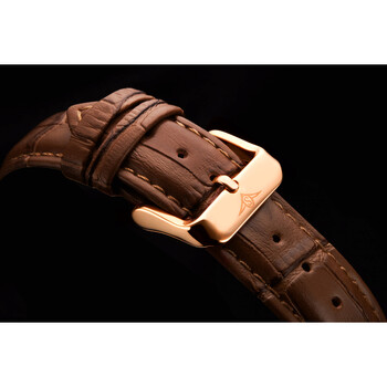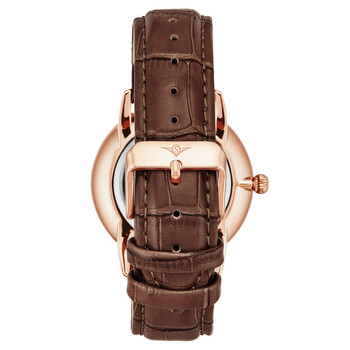 Rose gold-tone stainless steel case with a brown leather strap. Fixed rose gold-tone bezel. White dial with black hands and index hour markers. Minute markers around the outer rim. Dial Type: Analog. Date display at the 3 o'clock position. Quartz movement. Scratch resistant mineral crystal. Pull / push crown. Solid case back. Round case shape. Case size: 40 mm. Case thickness: 7 mm. Band width: 20 mm. Band length: 8.12 inches. Tang clasp. Water resistant at 50 meters / 165 feet. Functions: date, hour, minute, second. Symphony Series. Dress watch style. Stuhrling Original Symphony Quartz White Dial Men's Watch M16737.