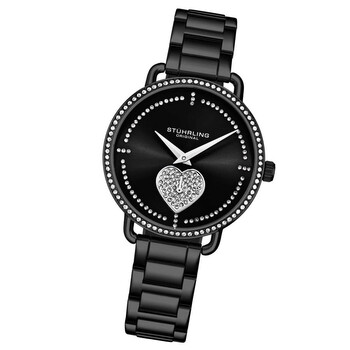 Black alloy case with a black stainless steel bracelet. Fixed black alloy bezel. Black dial with silver-tone hands and index hour markers. Minute markers around the outer rim. Dial Type: Analog. Quartz movement. Scratch resistant mineral crystal. Pull / push crown. Solid case back. Round case shape, case size: 38 mm, case thickness: 8 mm. Band length: 8.5 inches. Deployment with push button release clasp. Functions: hour, minute. Vogue Series. Fashion watch style. Stuhrling Original Vogue Quartz Black Dial Ladies Watch M17187.