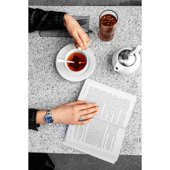 Silver-tone alloy case with a stainless steel bracelet. Uni-directional rotating coin edge silver-tone alloy bezel with an inlaid blue ring. Blue mother of pearl dial with luminous silver-tone Mercedes-logo, sword, and Breguet-style hands and dot hour markers. Minute markers around the outer rim. Dial Type: Analog. Luminescent hands and markers. Date display at the 3 o'clock position. Miyota caliber 2115 quartz movement. Scratch resistant mineral crystal. Screw down crown. Solid case back. Round case shape. Case size: 32 mm. Case thickness: 9 mm. Band length: 7 inches. Fold over clasp with a safety release. Water resistant at 100 meters / 330 feet. Functions: date, hour, minute, second. Vogue Series. Fashion watch style. Watch label: Japan Movt. Stuhrling Original Vogue Quartz Blue Dial Ladies Watch M13657.