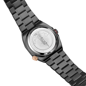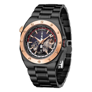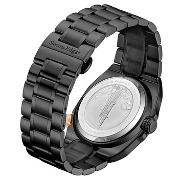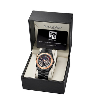 Black stainless steel case and bracelet. Bi-directional rotating rose gold-tone stainless steel bezel. Black dial with rose gold-tone hands and index hour markers. Minute markers around the outer rim. Dial Type: Analog. Luminescent hands and markers. Date display at the 3 o'clock position. Automatic movement. Scratch resistant mineral crystal. Solid case back. Tonneau case shape, case size: 44.5 mm, case thickness: 15 mm. Band width: 28 mm, band length: 8.5 inches. Fold over clasp with a safety release. Water resistant at 30 meters / 100 feet. Functions: date, hour, minute, second. Apollo Series. Luxury watch style. Swan Edgar Apollo Automatic Black Dial Men's Watch SE00971.