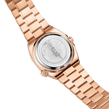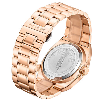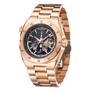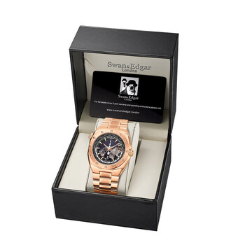 Rose gold-tone stainless steel case and bracelet. Fixed rose gold-tone stainless steel bezel. Black dial with rose gold-tone hands and index hour markers. Minute markers around the outer rim. Dial Type: Analog. Luminescent hands and markers. Date display at the 3 o'clock position. Automatic movement. Scratch resistant mineral crystal. Solid case back. Round case shape, case size: 44.5 mm, case thickness: 15 mm. Band width: 28 mm, band length: 8.5 inches. Fold over clasp with a safety release. Water resistant at 30 meters / 100 feet. Functions: date, hour, minute, second. Apollo Series. Luxury watch style. Swan Edgar Apollo Automatic Black Dial Men's Watch SE00972.