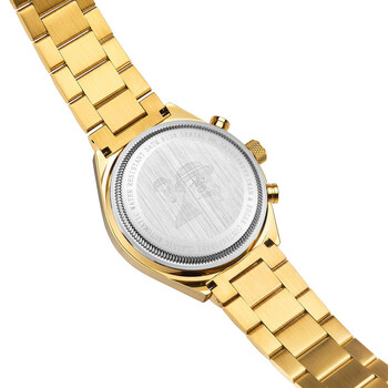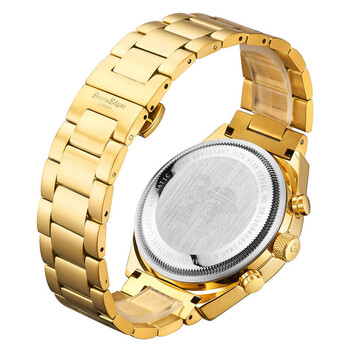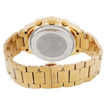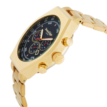 Yellow gold-tone stainless steel case and bracelet. Fixed yellow gold-tone stainless steel bezel. Black dial with yellow gold-tone hands and Arabic numeral & index hour markers. Minute markers around the outer rim. Dial Type: Analog. Luminescent hands and markers. Date display between 4 and 5 o'clock position. 60 second subdials. Automatic movement. Scratch resistant mineral crystal. Solid case back. Round case shape, case size: 45 mm, case thickness: 15 mm. Band width: 22 mm, band length: 8.5 inches. Fold over clasp with a safety release. Water resistant at 30 meters / 100 feet. Functions: month, date, day, hour, minute, second. Contemporary Classic Series. Luxury watch style. Swan Edgar Contemporary Classic Automatic Black Dial Men's Watch SE01212.