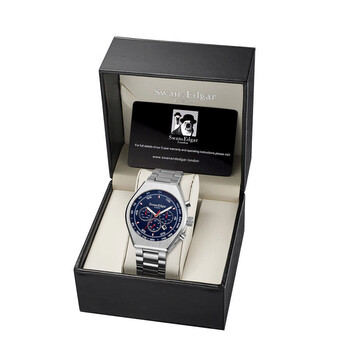 Silver-tone stainless steel case and bracelet. Fixed silver-tone stainless steel bezel. Blue dial with silver-tone hands and Arabic numeral & index hour markers. Minute markers around the outer rim. Dial Type: Analog. Luminescent hands and markers. Date display between 4 and 5 o'clock position. 60 second subdials. Automatic movement. Scratch resistant mineral crystal. Solid case back. Round case shape, case size: 45 mm, case thickness: 15 mm. Band width: 22 mm, band length: 8.5 inches. Fold over clasp with a safety release. Water resistant at 30 meters / 100 feet. Functions: monht, date, day, hour, minute, second. Contemporary Classic Series. Luxury watch style. Swan Edgar Contemporary Classic Automatic Blue Dial Men's Watch SE01211.