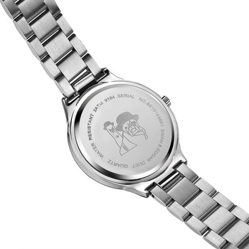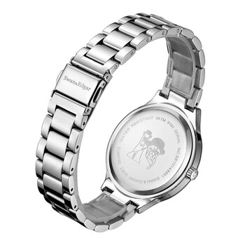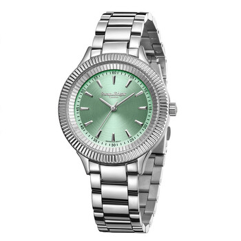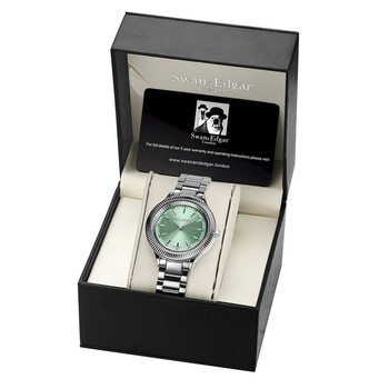 Silver-tone stainless steel case and bracelet. Fixed silver-tone stainless steel bezel. Green dial with silver-tone hands and index hour markers. Minute markers around the outer rim. Dial Type: Analog. Quartz movement. Scratch resistant mineral crystal. Solid case back. Round case shape, case size: 38 mm, case thickness: 10.5 mm. Band width: 16 mm, band length: 7.75 inches. Fold over clasp with a safety release. Water resistant at 30 meters / 100 feet. Functions: hour, minute, second. Duet Series. Luxury watch style. Watch label: Swiss Made. Swan Edgar Duet Quartz Green Dial Ladies Watch SEL051.
