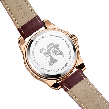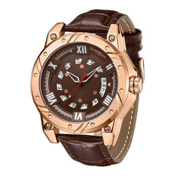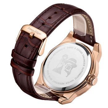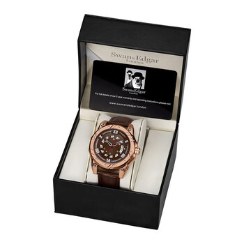 Rose gold-tone stainless steel case with a brown leather strap. Fixed rose gold-tone stainless steel bezel. Brown dial with silver-tone hands and Roman numeral hour markers. Minute markers around the outer rim. Dial Type: Analog. Date display around an inner circle. Automatic movement. Scratch resistant mineral crystal. Solid case back. Round case shape, case size: 45 mm, case thickness: 15 mm. Band width: 22 mm, band length: 7.75 inches. Water resistant at 30 meters / 100 feet. Functions: date, hour, minute, second. Engineer Series. Luxury watch style. Swan Edgar Engineer Automatic Brown Dial Men's Watch SE1642.
