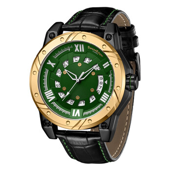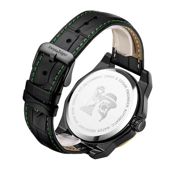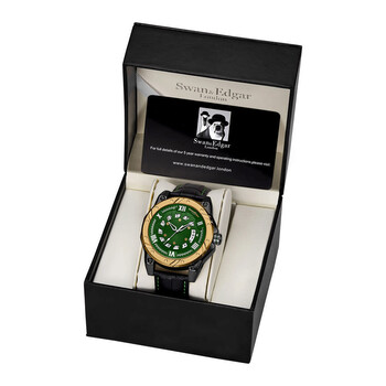 Black stainless steel case with a black leather strap. Fixed yellow gold-tone stainless steel bezel. Green dial with silver-tone hands and Roman numeral hour markers. Minute markers around the outer rim. Dial Type: Analog. Date display around an inner circle. Automatic movement. Scratch resistant mineral crystal. Solid case back. Round case shape, case size: 45 mm, case thickness: 15 mm. Band width: 22 mm, band length: 7.75 inches. Water resistant at 30 meters / 100 feet. Functions: date, hour, minute, second. Engineer Series. Luxury watch style. Swan Edgar Engineer Automatic Green Dial Men's Watch SE1641.