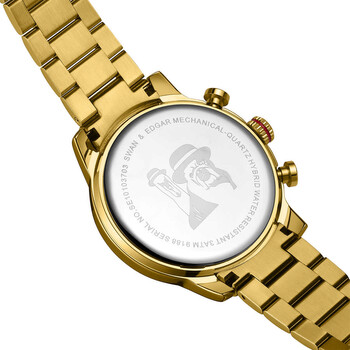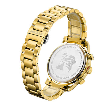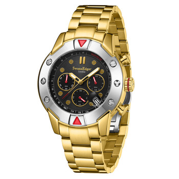 Yellow gold-tone stainless steel case and bracelet. Fixed silver-tone stainless steel bezel. Black dial with yellow gold-tone hands and index hour markers. Minute markers around the outer rim. Dial Type: Analog. Luminescent hands. Date display between 4 and 5 o'clock position. Chronograph - sub-dials displaying: 24 hour. Hand wind movement. Scratch resistant mineral crystal. Solid case back. Round case shape, case size: 45 mm, case thickness: 15 mm. Band width: 18 mm, band length: 7.75 inches. Fold over clasp with a safety release. Water resistant at 30 meters / 100 feet. Functions: chronograph, date, hour, minute, second. Additional Info: quartz-mechanical hybrid movement. Hybrid Series. Luxury watch style. Watch label: Seiko. Swan Edgar Hybrid Chronograph Hand Wind Black Dial Men's Watch SE1771.