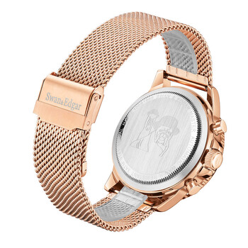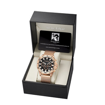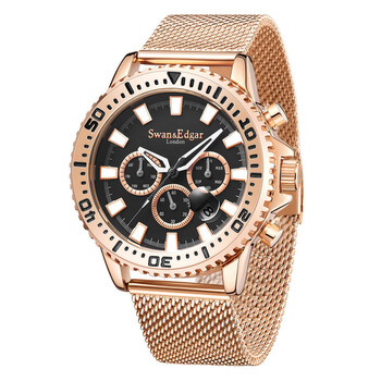Rose gold-tone stainless steel case and bracelet. Bi-directional rotating rose gold-tone stainless steel bezel. Black dial with white hands and index hour markers. Minute markers around the outer rim. Dial Type: Analog. Luminescent hands and markers. Date display between 4 and 5 o'clock position. 60 minute subdials. Automatic movement. Scratch resistant mineral crystal. Solid case back. Round case shape, case size: 45 mm, case thickness: 15 mm. Band width: 20 mm, band length: 7.75 inches. Fold over clasp with a safety release. Water resistant at 30 meters / 100 feet. Functions: month, date, day, hour, minute, second. Master Series. Luxury watch style. Swan Edgar Master Automatic Black Dial Men's Watch SE01402.