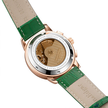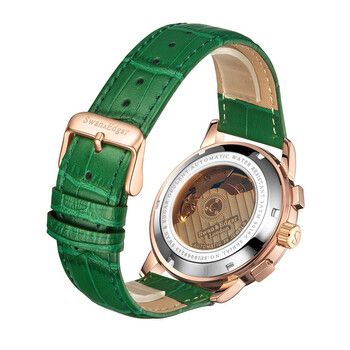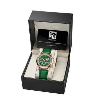 Rose gold-tone stainless steel case with a green leather strap. Fixed rose gold-tone stainless steel bezel. Green dial with rose gold-tone hands and index hour markers. Minute markers around the outer rim. Dial Type: Analog. Luminescent hands. Date display between 4 and 5 o'clock position. Automatic movement. Scratch resistant mineral crystal. Transparent case back. Round case shape, case size: 43 mm, case thickness: 15 mm. Band width: 22 mm, band length: 8.5 inches. Buckle clasp. Water resistant at 30 meters / 100 feet. Functions: month, date, day, hour, minute, second. Opulent Series. Luxury watch style. Swan Edgar Opulent Automatic Green Dial Men's Watch SE0030.