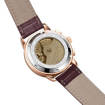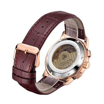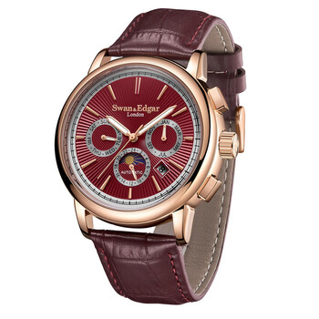 Rose gold-tone stainless steel case with a red leather strap. Fixed rose gold-tone stainless steel bezel. Red dial with rose gold-tone hands and index hour markers. Minute markers around the outer rim. Dial Type: Analog. Luminescent hands. Date display between 4 and 5 o'clock position. Automatic movement. Scratch resistant mineral crystal. Transparent case back. Round case shape, case size: 43 mm, case thickness: 15 mm. Band width: 22 mm, band length: 8.5 inches. Buckle clasp. Water resistant at 30 meters / 100 feet. Functions: month, date, day, hour, minute, second. Opulent Series. Luxury watch style. Swan Edgar Opulent Automatic Red Dial Men's Watch SE00301.