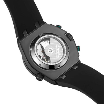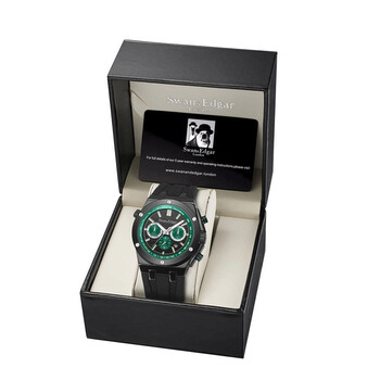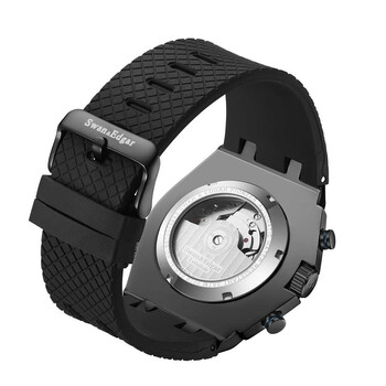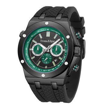 Black stainless steel case with a black silicone strap. Bi-directional rotating black stainless steel bezel. Multi-color dial with silver-tone hands and index hour markers. Minute markers around the outer rim. Dial Type: Analog. Luminescent hands and markers. Date display between 4 and 5 o'clock position. Automatic movement. Scratch resistant mineral crystal. Transparent case back. Round case shape, case size: 45 mm, case thickness: 15 mm. Band width: 23 mm, band length: 7 inches. Buckle clasp. Water resistant at 30 meters / 100 feet. Functions: date, day, hour, minute, second. Pioneer Series. Luxury watch style. Swan Edgar Pioneer Automatic Men's Watch SE0063.