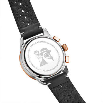 Silver-tone stainless steel case with a black leather strap. Fixed tachymeter scale black stainless steel bezel. Two-tone dial with rose gold-tone hands and index hour markers. Minute markers around the outer rim. Dial Type: Analog. Luminescent hands and markers. Date display between 4 and 5 o'clock position. Hand wind movement. Scratch resistant mineral crystal. Solid case back. Round case shape, case size: 45 mm, case thickness: 15 mm. Band width: 20 mm, band length: 7.75 inches. Water resistant at 30 meters / 100 feet. Functions: chronograph, date, hour, minute, second. Additional Info: quartz-mechanical hybrid movement. Racer Series. Luxury watch style. Watch label: Seiko. Swan Edgar Racer Chronograph Hand Wind Men's Watch SE1781.