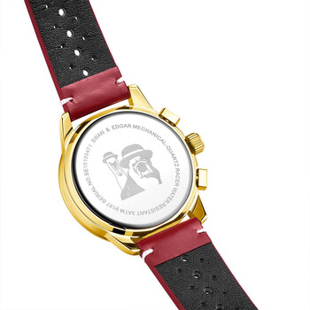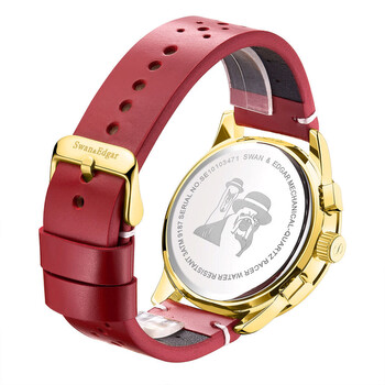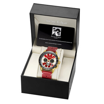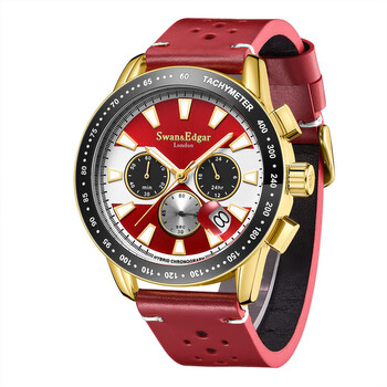 Yellow gold-tone stainless steel case with a red leather strap. Fixed tachymeter scale black stainless steel bezel. Two-tone dial with yellow gold-tone hands and index hour markers. Minute markers around the outer rim. Dial Type: Analog. Luminescent hands and markers. Date display between 4 and 5 o'clock position. Chronograph - sub-dials displaying: 24 hour. Hand wind movement. Scratch resistant mineral crystal. Solid case back. Round case shape, case size: 45 mm, case thickness: 15 mm. Band width: 20 mm, band length: 7.75 inches. Water resistant at 30 meters / 100 feet. Functions: chronograph, date, hour, minute, second. Additional Info: quartz-mechanical hybrid movement. Racer Series. Luxury watch style. Watch label: Seiko. Swan Edgar Racer Chronograph Hand Wind Men's Watch SE1782.