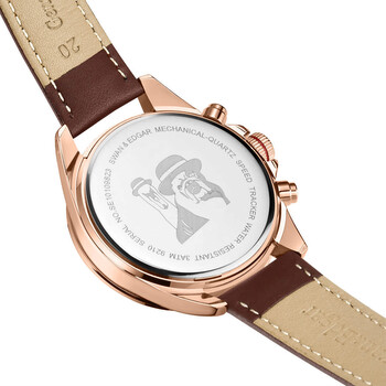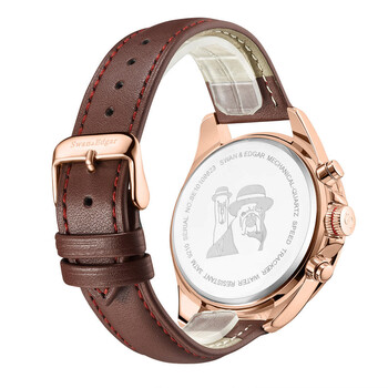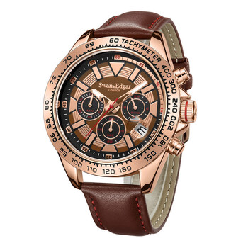 Rose gold-tone stainless steel case with a brown leather strap. Fixed tachymeter scale rose gold-tone stainless steel bezel. Brown dial with rose gold-tone hands and index hour markers. Minute markers around the outer rim. Dial Type: Analog. Luminescent hands and markers. Date display between 4 and 5 o'clock position. Chronograph - sub-dials displaying: 60 minute. Automatic movement. Scratch resistant mineral crystal. Solid case back. Round case shape, case size: 45 mm, case thickness: 15 mm. Band width: 20 mm, band length: 7.75 inches. Water resistant at 30 meters / 100 feet. Functions: chronograph, date, hour, minute, second. Speed Tracker Series. Luxury watch style. Swan Edgar Speed Tracker Chronograph Automatic Brown Dial Men's Watch SE2001.