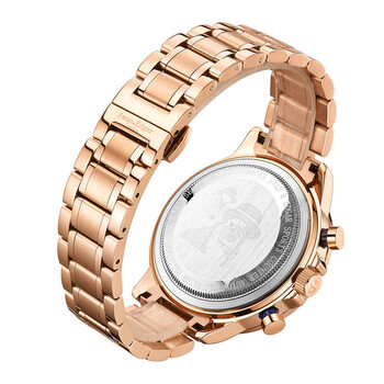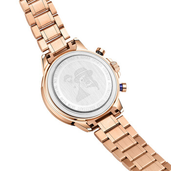Rose gold-tone stainless steel case and bracelet. Bi-directional rotating multi-color stainless steel bezel. Blue dial with rose gold-tone hands and index hour markers. Minute markers around the outer rim. Dial Type: Analog. Luminescent hands and markers. Date display between 4 and 5 o'clock position. 60 second subdials. Automatic movement. Scratch resistant mineral crystal. Solid case back. Round case shape, case size: 45 mm, case thickness: 15 mm. Band width: 22 mm, band length: 8.5 inches. Fold over clasp with a safety release. Water resistant at 30 meters / 100 feet. Functions: month, date, day, hour, minute, second. Sports Counter Series. Sport watch style. Swan Edgar Sports Counter Automatic Blue Dial Men's Watch SE01323.